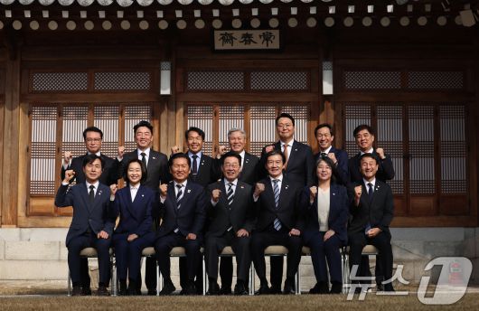 (서울=뉴스1) 허경 기자 = 이재명 대통령이 16일 청와대 상춘재에서 열린 정당 지도부 초청 오찬에서 여야 지도부들과 기념촬영을 하고 있다. (청와대통신사진기자단) 2026.1.16/뉴스1seiyu@news1.krCopyright ⓒ 뉴스1. All rights reserved. 무단 전재 및 재배포, AI학습 이용 금지.