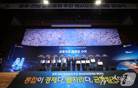 (광주=뉴스1) 박지현 기자 = 16일 오후 광주 서구 김대중컴벤션센터에서 강기정 광주시장과 국회의원, 공공기관장 등이 함께하는 '광주전남 행정통합 추진 시도민협의회' 발대식에서 공동대표에 위촉장이 수여되고 있다. 2026.1.16/뉴스1warm@news1.krCopyright ⓒ 뉴스1. All rights reserved. 무단 전재 및 재배포, AI학습 이용 금지.