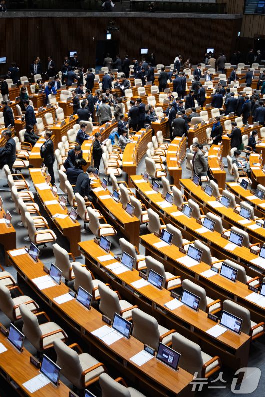 (서울=뉴스1) 유승관 기자 = 16일 서울 여의도 국회에서 열린 제431회 국회(임시회) 제1차 본회의에서 윤석열·김건희에 의한 내란·외환 및 국정농단 행위의 진상규명을 위한 특별검사 임명 등에 관한 법률안(2차 종합 특검법)이 재석 174인 중 찬성 172인, 반대 2인으로 가결된 후 여당 의원들이 본회의장을 나서고 있다. 2026.1.16/뉴스1