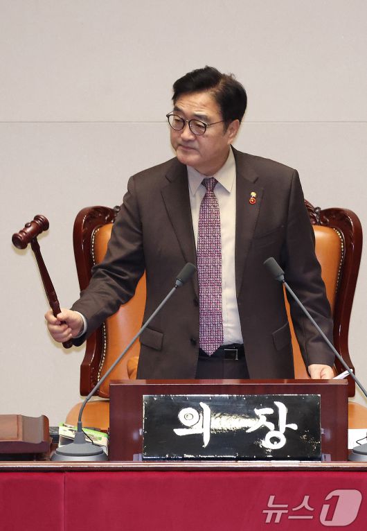 (서울=뉴스1) 신웅수 기자 = 우원식 국회의장이 16일 서울 여의도 국회에서 열린 제431회 국회(임시회) 제1차 본회의에서 윤석열·김건희에 의한 내란·외환 및 국정농단 행위의 진상규명을 위한 특별검사 임명 등에 관한 법률안(2차 종합 특검법) 통과를 알리며 의사봉을 두드리고 있다. 2026.1.16/뉴스1