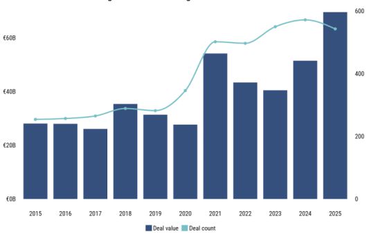 [이데일리 마켓in 김연지 기자] 유럽 금융서비스 산업을 둘러싼 사모펀드(PEF) 자금 유입이 지난해 사상 최고 수준으로 늘어난 것으로 나타났다. 은행과 자산운용, 보험 업종 전반에서 경쟁이 심화하면서 디지털 전환과 경영 효율화를 위한 인수·합병(M&A) 수요가 커진 영향이다.