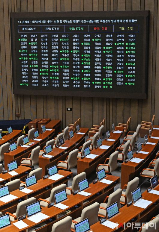 아시아투데이 송의주 기자 = 16일 국회에서 열린 본회의에서 윤석열·김건희에 의한 내란·외환 및 국정농단 행위의 진상규명을 위한 특별검사 임명 등에 관한 법률안이 재석 174명 중 찬성 172명, 반대 2명으로 통과되고 있다.