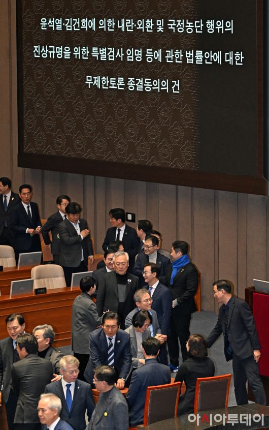 아시아투데이 송의주 기자 = 정청래 더불어민주당 대표를 비롯한 의원들이 16일 국회에서 열린 본회의에서 윤석열·김건희에 의한 내란·외환 및 국정농단 행위의 진상규명을 위한 특별검사 임명 등에 관한 법률안에 대한 무제한토론 종결동의의 건 투표를 하고 있다. ⓒ "젊은 파워, 모바일 넘버원 아시아투데이"