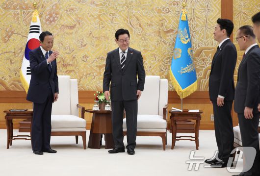 (서울=뉴스1) 허경 기자 = 아소 다로 전 일본 총리가 16일 청와대를 방문해 이재명 대통령과의 면담에 앞서 위성락 안보실장에게 인사하고 있다. 2026.1.16/뉴스1neohk@news1.krCopyright ⓒ 뉴스1. All rights reserved. 무단 전재 및 재배포, AI학습 이용 금지.