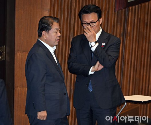 아시아투데이 송의주 기자 = 김민석 국무총리(오른쪽)가 16일 국회에서 열린 본회의에서 김병주 더불어민주당 의원과 이야기를 나누고 있다. ⓒ "젊은 파워, 모바일 넘버원 아시아투데이"
