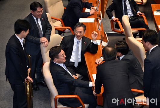 아시아투데이 송의주 기자 = 정성호 법무부 장관과 윤호중 행정안전부 장관을 비롯한 의원들이 16일 국회에서 열린 본회의에서 이야기를 나누고 있다. ⓒ "젊은 파워, 모바일 넘버원 아시아투데이"