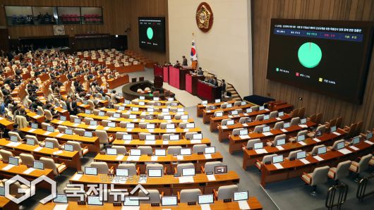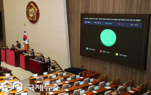 (서울=국제뉴스) 16일 오후 서울 여의도 국회에서 열린 제431회국회(임시회) 제1차 본회의에서 '윤석열ㆍ김건희에 의한 내란ㆍ외환 및 국정농단 행위의 진상 규명을 위한 특별검사 임명 등에 관한 법률안' 이 재석 174인, 찬성 172인, 반대 2인으로 가결되고 있다./사진=이용우 기자