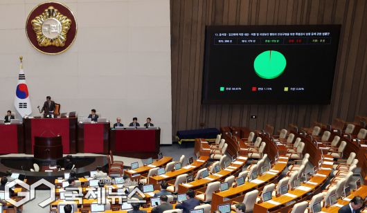 (서울=국제뉴스) 16일 오후 서울 여의도 국회에서 열린 제431회국회(임시회) 제1차 본회의에서 '윤석열ㆍ김건희에 의한 내란ㆍ외환 및 국정농단 행위의 진상 규명을 위한 특별검사 임명 등에 관한 법률안' 이 재석 174인, 찬성 172인, 반대 2인으로 가결되고 있다./사진=이용우 기자