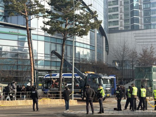 16일 서울 종로구 서대문역 사거리에서 발생한 시내버스 돌진사고에 경찰·소방 당국이 수습에 나선 모습. 이날 오후 4시께 농협중앙회 중앙본부 신관 건물에 들이받은 704번 버스를 빼내고 있다. 정주원 기자 |