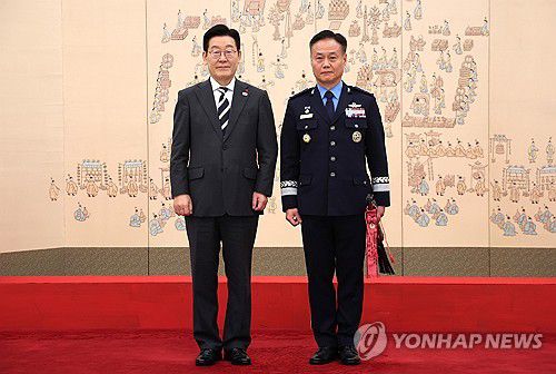 (서울=연합뉴스) 김도훈 기자 = 이재명 대통령이 16일 청와대 본관에서 열린 3성 장군 진급·보직 신고 및 수치 수여식에서 김준호 국방정보본부장과 기념촬영을 하고 있다. 2026.1.16