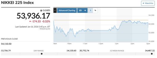 일본증시 닛케이225지수 등락 추이. 16일 종가 5만3936.17. 출처 마켓워치 |