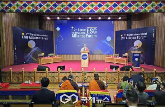 (부탄=국제뉴스) 유지현 기자 = 9일 부탄 팀푸시 부탄왕립대학교(RUB)에서 열린 제2회 부탄 국제 ESG 동맹포럼(The 2nd Bhutan International ESG Alliance Forum) 개막식에서 대한불교조계종 총무원장 진우스님의 축사를 선일스님이 대독했다.