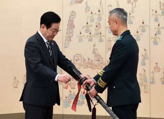 이재명 대통령은 16일 청와대 본관 충무실에서 군 3성 장군인 중장 진급자 20명으로부터 진급·보직 신고를 받고 삼정검 수치를 수여했다.