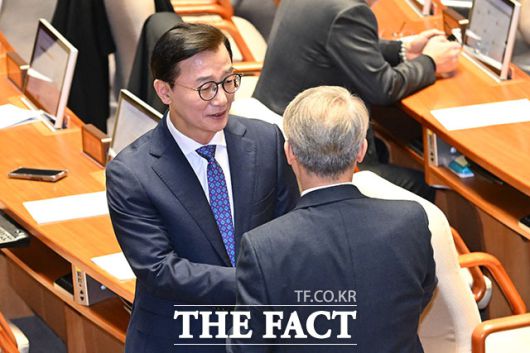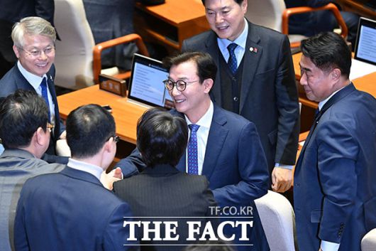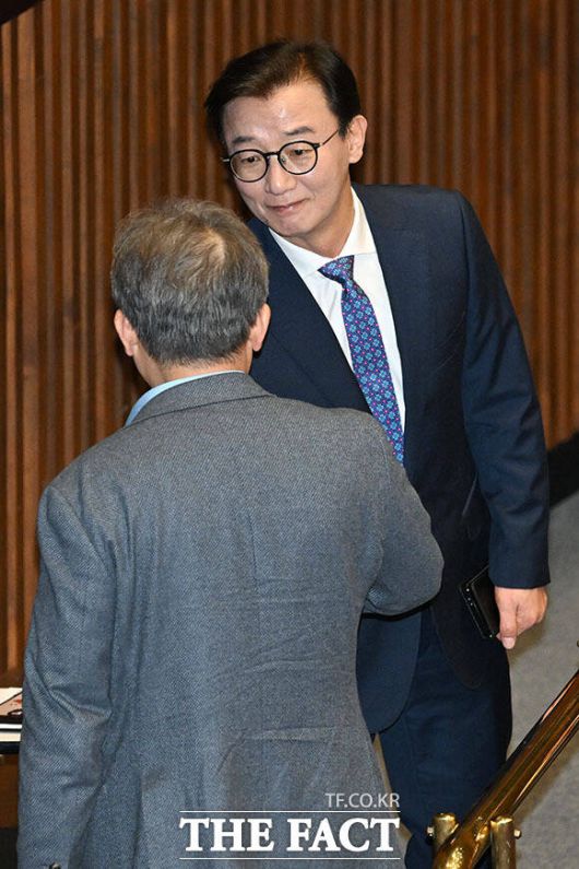 [더팩트ㅣ국회=남용희 기자] 통일교 금품수수 의혹을 받는 전재수 더불어민주당 의원이 16일 오후 서울 여의도 국회에서 열린 제431회 국회(임시회) 제1차 본회의에 참석해 동료 의원들과 인사를 나누고 있다.