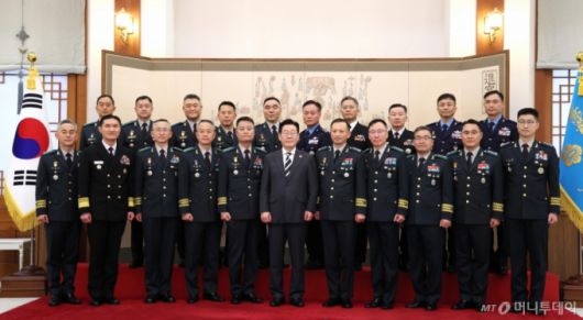 이 대통령은 이날 오후 박성제 특수전사령관 등 중장 진급자 20명으로부터 보직 신고를 받고 삼정검(三精劍) 직위와 이름, 날짜가 수놓아진 붉은색 수치를 직접 달아줬다. 삼정검은 육군·해군·공군 3군이 일치해 호국·통일·번영의 3가지 정신을 달성한다는 뜻을 지닌다. 수치는 끈으로 된 깃발이다.