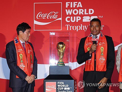 (엑스포츠뉴스 용산, 나승우 기자) 코카-콜라 특별 전세기를 타고 한국에 상륙한 오리지널 국제축구연맹(FIFA) 월드컵 트로피가 국내 팬들에게 공개됐다.