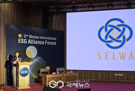 (부탄=국제뉴스) 유지현 기자 = 9일 부탄 팀푸시 부탄왕립대학교(RUB)에서 열린 제2회 부탄 국제 ESG 동맹포럼(The 2nd Bhutan International ESG Alliance Forum)에서 부탄 SELWA의 Peldon Tshering 사무국장이 SELWA를 소개하는 프레젠테이션을 진행했다.