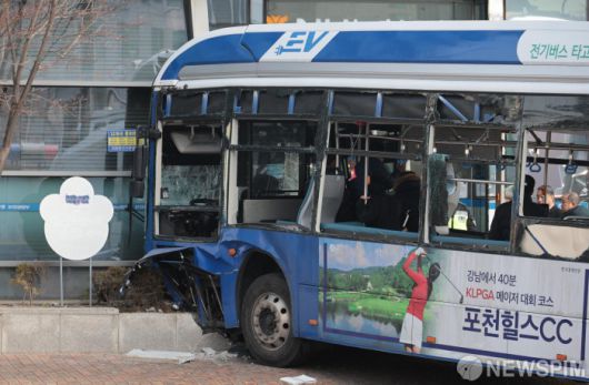 [서울=뉴스핌] 이길동 기자 =16일 서울 서대문역 사거리에서 인도로 돌진한 버스가 건물에 충돌해 있다.2026.01.16 gdlee@newspim.com