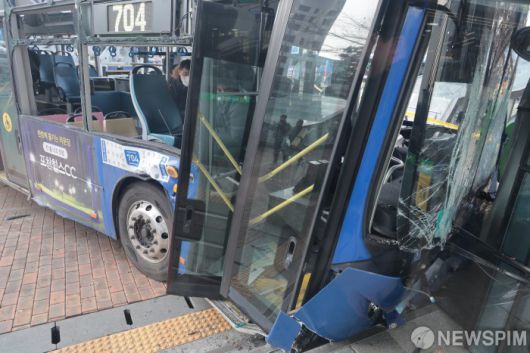 [서울=뉴스핌] 이길동 기자 =16일 서울 서대문역 사거리에서 인도로 돌진한 버스가 건물에 충돌해 있다.2026.01.16 gdlee@newspim.com