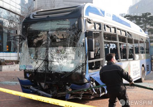 [서울=뉴스핌] 이길동 기자 = 16일 오후 서울 서대문역 사거리에서 인도로 돌진해 건물과 충돌한 버스가 견인되고 있다. 2026.01.16 gdlee@newspim.com |