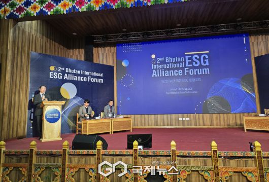 (부탄=국제뉴스) 유지현 기자 = 10일 부탄 팀푸시 부탄왕립대학교(RUB)에서 열린 제2회 부탄 국제 ESG 동맹포럼(The 2nd Bhutan International ESG Alliance Forum) '기업 탄소중립 정책대응과 경영 전략' 세션에서 황준석 한국여행업협회(KATA) 상근부회장이 '관광의 재구성: 성장에서 지속가능·공정 관광으로(Rethinking Tourism: From Growth to Sustainable and Fair Tourism)'를 주제로 발표했다.