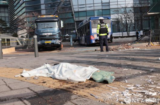 [서울=뉴스핌] 이길동 기자 =16일 오후 서울 서대문역 인근에서 시내버스가 인도와 건물로 돌진하는 사고가 발생해 경찰과 소방대원들이 현장을 수습하고 있다.2026.01.16 gdlee@newspim.com