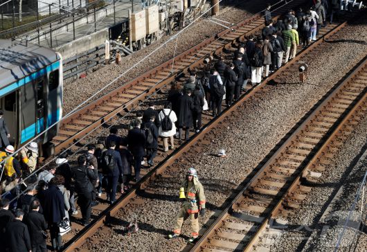 2026년 1월 16일 일본 도쿄에서 전력 장애로 멈춰 선 케이힌토호쿠선 열차의 승객들이 타마치역을 향해 선로 위를 걸어 이동하고 있다. ⓒ 로이터=뉴스1 |
