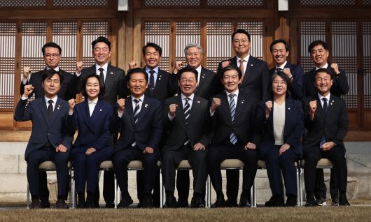 이재명 대통령이 16일 청와대 상춘재에서 열린 정당 지도부 초청 오찬에서 참석자들과 기념촬영하고 있다. 앞줄 왼쪽부터 사회민주당 한창민 대표, 진보당 김재연 대표, 더불어민주당 정청래 대표, 이재명 대통령, 조국혁신당 조국 대표, 기본소득당 용혜인 대표, 더불어민주당 한병도 원내대표. 뒷줄 왼쪽부터 이규연 홍보소통수석, 강훈식 비서실장, 진보당 윤종오 원내대표, 조국혁신당 서왕진 원내대표, 개혁신당 천하람 원내대표, 우상호 정무수석, 김병욱 정무비서관. 연합뉴스 |