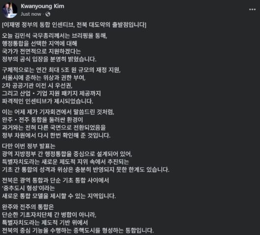 김관영 도지사는 16일 자신의 개인 SNS에 입장문을 내고 김민석 국무총리의 행정통합 지원 방안 발표와 관련해 "완주·전주 통합을 둘러싼 환경이 과거와는 전혀 다른 국면으로 전환되었음을 정부 차원에서 확인해 준 것"이라며 환영의 뜻을 밝혔다.
