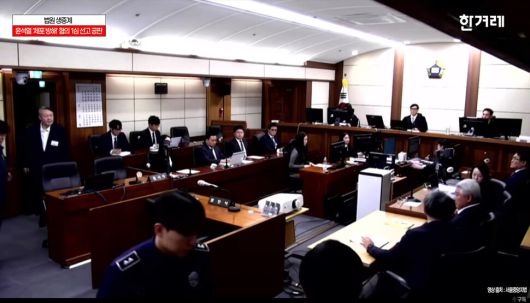 고위공직자범죄수사처의 체포영장 집행을 방해한 혐의(특수공무집행방해) 등으로 기소된 윤석열 전 대통령이 16일 오후 서울 서초구 서울중앙지방법원에서 열린 1심 선고 공판에 참석하고 있다. 한겨레티브이 화면 갈무리 |
