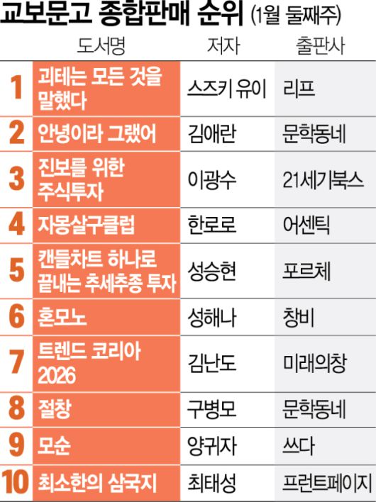 재테크 도서의 약진도 눈에 띈다. 이광수의 ‘진보를 위한 주식투자’가 3위로 상승했고 성승현의 ‘캔들차트 하나로 끝내는 추세추종 투자’가 5위에 진입했다. 트렌드서 ‘트렌드 코리아 2026’는 7위로 꾸준한 관심을 이어갔다.