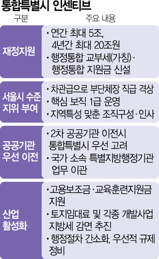정부가 공개한 통합특별시 인센티브안에는 ‘통합의 적기를 놓칠 수 없다’는 강력한 의지가 담겼다. 입법 및 향후 재원 마련 등 난관이 산적해 있지만 6월 지방선거를 통해 지방자치단체장이 새로 선출되기 전까지 행정 통합의 기반을 갖춰놓아야 실질적인 지방자치를 구현할 수 있다는 것이다.