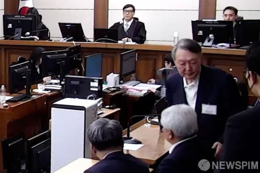 [서울=뉴스핌] 윤석열 전 대통령이 16일 서울 서초구 서울중앙지법에서 열린 체포방해 등 혐의 사건 1심 선고 공판을 마치고 퇴장하고 있다. 백대현 부장판사는 윤 전 대통령에게 징역 5년을 선고했다. [사진=서울중앙지법] 2026.01.16 photo@newspim.com |