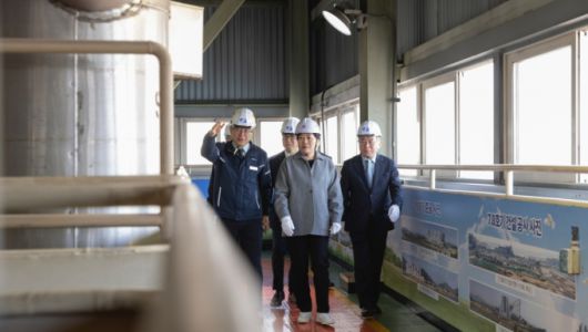 김준동 한국남부발전 사장(오른쪽)이 송미령 농림축산식품부 장관(가운데)과 하동 7, 8호기 현장을 살펴보고 있다./사진제공=한국남부발전 |