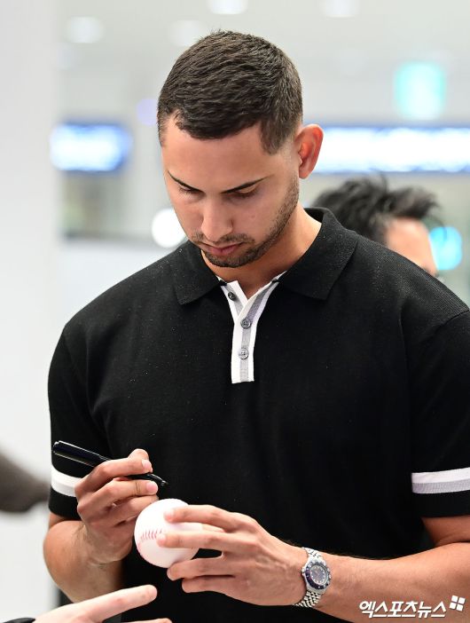 (엑스포츠뉴스 인천공항, 박지영 기자) 프로야구 한화 이글스의 베네수엘라 출신 외국인 선수 요나단 페라자와 윌켈 에르난데스가 16일 오후 인천국제공항을 통해 입국했다. 에르난데스가 입국장에서 팬에게 사인을 해주고 있다.박지영 기자 jypark@xportsnews.com
