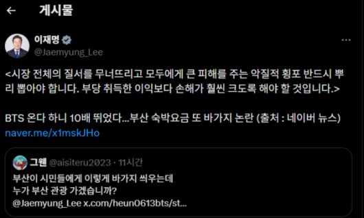 이재명 대통령은 16일 자신의 X(구 트위터) 계정을 통해 부산 지역 숙박업소의 과도한 요금 인상 실태를 겨냥, "시장 전체의 질서를 무너뜨리고 모두에게 큰 피해를 주는 악질적 횡포는 반드시 뿌리 뽑아야 한다"라고 강도 높게 비판했다.