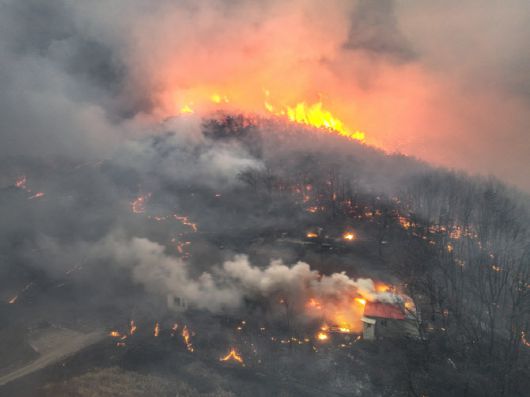 경북 의성군 대형 산불 발생 사흘째인 지난해 3월 24일 의성군 옥산면 전흥리에서 강풍을 타고 번진 산불이 민가를 덮치고 있다. (사진=연합뉴스) |