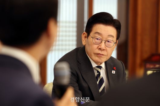 이재명 대통령이 16일 청와대 상춘재에서 열린 여야 지도부 초청 오찬 간담회에서 한창민 사회민주당 대표의 발언을 듣고 있다. 김창길 기자 |