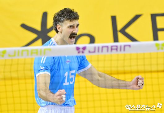 (엑스포츠뉴스 의정부, 김한준 기자) 16일 오후 경기도 의정부실내체육관에서 열린 '진에어 2025-2026 V-리그' KB손해보험과 대한항공의 경기, 대한항공 러셀이 서브 득점을 기록한 후 기뻐하고 있다.