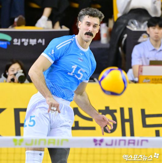 (엑스포츠뉴스 의정부, 김한준 기자) 16일 오후 경기도 의정부실내체육관에서 열린 '진에어 2025-2026 V-리그' KB손해보험과 대한항공의 경기, 대한항공 러셀이 서브를 시도하고 있다.김한준 기자 kowel@xportsnews.com