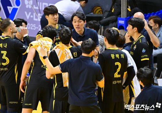 (엑스포츠뉴스 의정부, 김한준 기자) 16일 오후 경기도 의정부실내체육관에서 열린 '진에어 2025-2026 V-리그' KB손해보험과 대한항공의 경기, KB손해보험 하현용 감독대행이 작전타임을 갖고 있다.김한준 기자 kowel@xportsnews.com