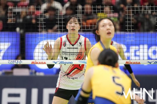 (MHN 수원, 박태성 기자) 16일 수원실내체육관에서 '2025-2026 V-리그 여자부' 현대건설과 정관장 경기가 열렸다. 정관장은 승점 18(6승 16패)로 7위 최하위를 기록 중이며 현대건설은 2위(승점 39)에 올라 있다. 정관장 정호영이 경기를 펼치고 있다. <저작권자 Copyright ⓒ MHN / 엠에이치앤 무단전재 및 재배포 금지>