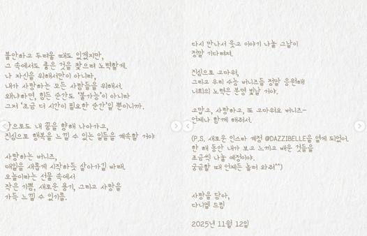 특히 그는 "민지, 하니, 해린, 혜인은 나의 두 번째 가족"이라며 뉴진스 멤버들을 직접 언급해 눈길을 끌었다. "같이 활동한 시간이 어긋났지만 우리를 갈라놓을 수 있는 건 아무것도 없다"며 멤버들과의 유대감이 여전함을 강조했다.