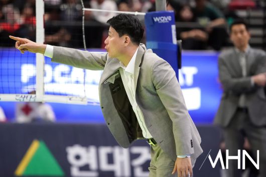 (MHN 수원, 박태성 기자) 16일 수원실내체육관에서 '2025-2026 V-리그 여자부' 현대건설과 정관장 경기가 열렸다. 정관장은 승점 18(6승 16패)로 7위 최하위를 기록 중이며 현대건설은 2위(승점 39)에 올라 있다. 현대건설 강성형 감독이 작전 지시를 내리고 있다. <저작권자 Copyright ⓒ MHN / 엠에이치앤 무단전재 및 재배포 금지>