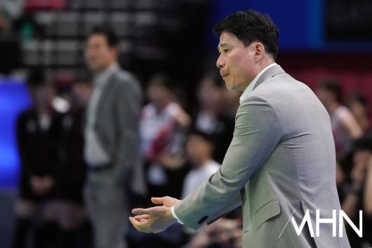 (MHN 수원, 박태성 기자) 16일 수원실내체육관에서 '2025-2026 V-리그 여자부' 현대건설과 정관장 경기가 열렸다. 정관장은 승점 18(6승 16패)로 7위 최하위를 기록 중이며 현대건설은 2위(승점 39)에 올라 있다. 현대건설 강성형 감독이 지시를 내리고 있다. <저작권자 Copyright ⓒ MHN / 엠에이치앤 무단전재 및 재배포 금지>
