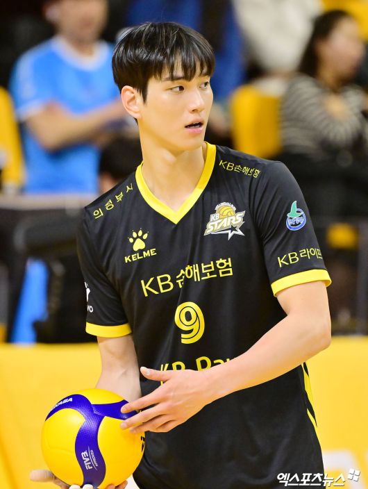 (엑스포츠뉴스 의정부, 김한준 기자) 16일 오후 경기도 의정부실내체육관에서 열린 '진에어 2025-2026 V-리그' KB손해보험과 대한항공의 경기, KB손해보험 임성진이 서브에이스를 기록하고 있다.김한준 기자 kowel@xportsnews.com