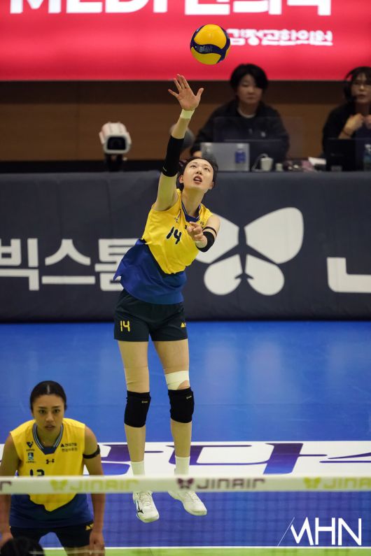 (MHN 수원, 박태성 기자) 16일 수원실내체육관에서 '2025-2026 V-리그 여자부' 현대건설과 정관장 경기가 열렸다. 정관장은 승점 18(6승 16패)로 7위 최하위를 기록 중이며 현대건설은 2위(승점 39)에 올라 있다. 현대건설 양효진이 경기를 펼치고 있다. <저작권자 Copyright ⓒ MHN / 엠에이치앤 무단전재 및 재배포 금지>