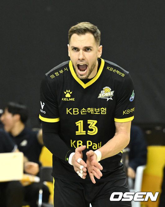 [OSEN=의정부, 이대선 기자] 16일 경기도 의정부시 경민대학교 체육관에서 ‘진에어 2025~2026 프로배구 V리그’ KB손해보험과 대한항공의 경기가 열렸다. 홈팀 KB손해보험은 12승 10패 승점 37로 3위, 방문팀 대한항공은 14승 7패 승점 42로 1위를 기록하고 있다. 2세트 KB손해보험 비예나가 득점 후 환호하고 있다. 2026.01.16 /sunday@osen.co.kr