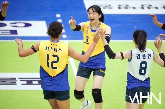 (MHN 수원, 박태성 기자) 16일 수원실내체육관에서 '2025-2026 V-리그 여자부' 현대건설과 정관장 경기가 열렸다. 정관장은 승점 18(6승 16패)로 7위 최하위를 기록 중이며 현대건설은 2위(승점 39)에 올라 있다. 현대건설 김다인이 경기를 펼치고 있다. <저작권자 Copyright ⓒ MHN / 엠에이치앤 무단전재 및 재배포 금지>