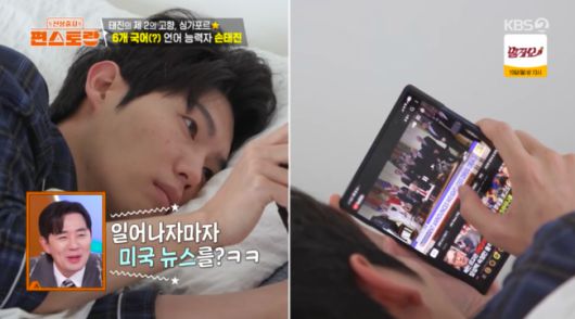 이날 손태진은 알람 소리에 일어나자마자 한글 자막 없이 미국 뉴스를 시청했다. 2배속으로 보던 그는 이번엔 프랑스 뉴스, 중국 뉴스까지 시청해 모두를 놀라게 했다.